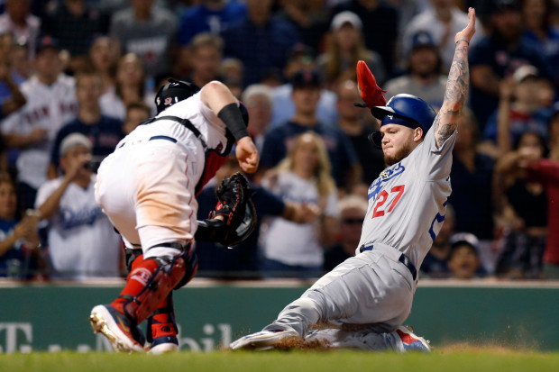 Boston Red Sox’s Christian Vazquez tags out Los Angeles Dodgers’ Alex Verdugo (27) at home plate during the 11th inning of a baseball game in Boston, Sunday, July 14, 2019. (AP Photo/Michael Dwyer)